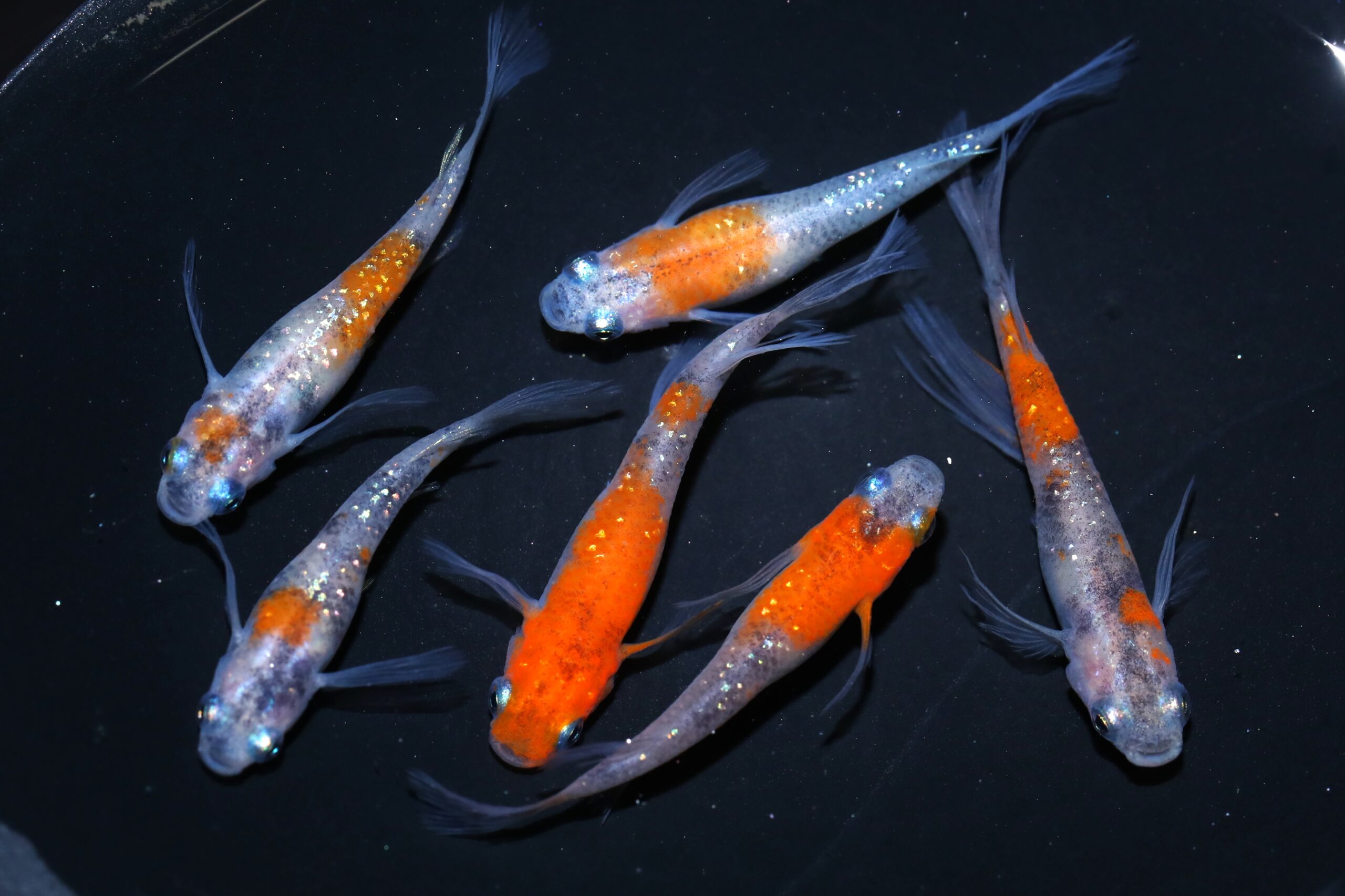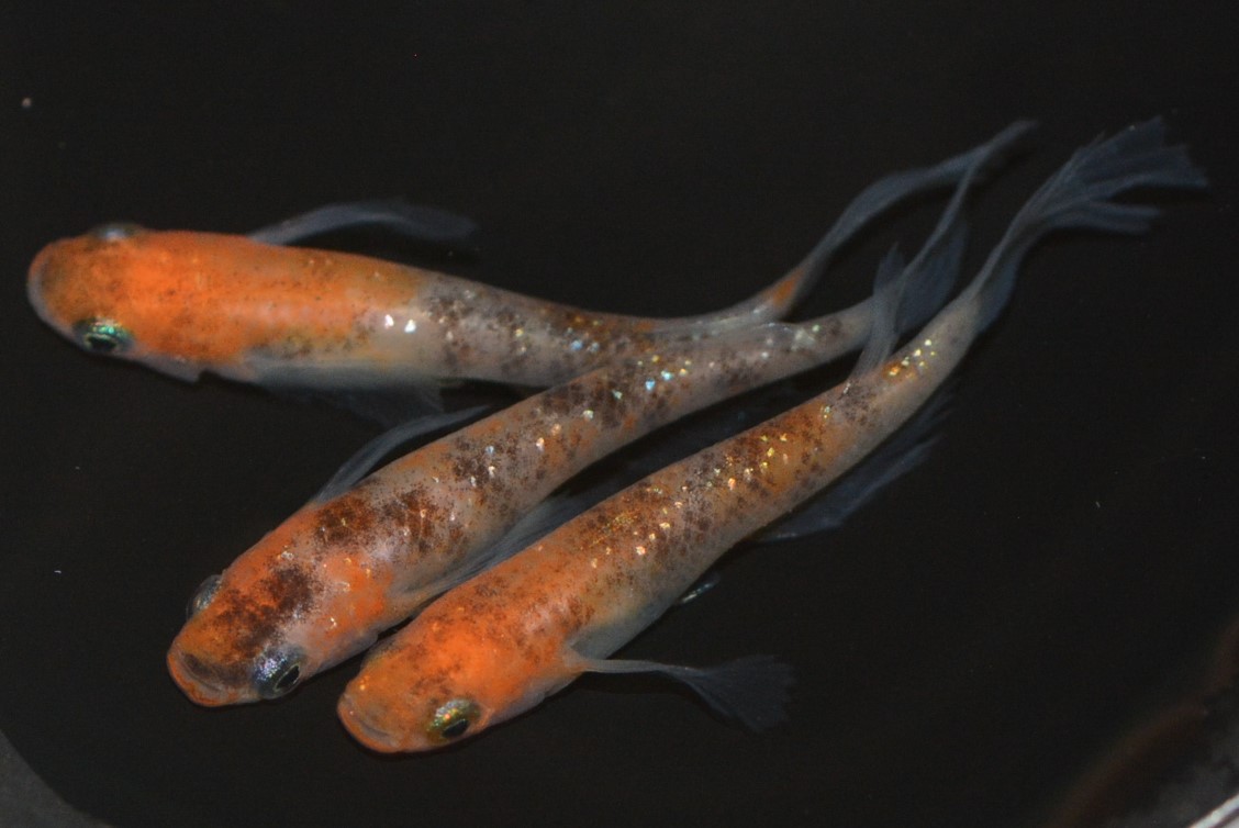 三色ラメ幹之にヒレ長の形質を遺伝したメダカです。