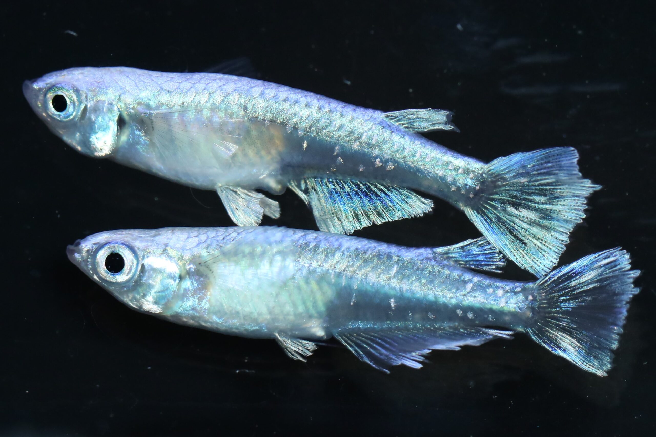 青体色で体外光とモルフォの形質を持つメダカです。尾ビレの形が扇状になり、ヒレの先が丸みのあるギザギザのようになる特徴のメダカです。