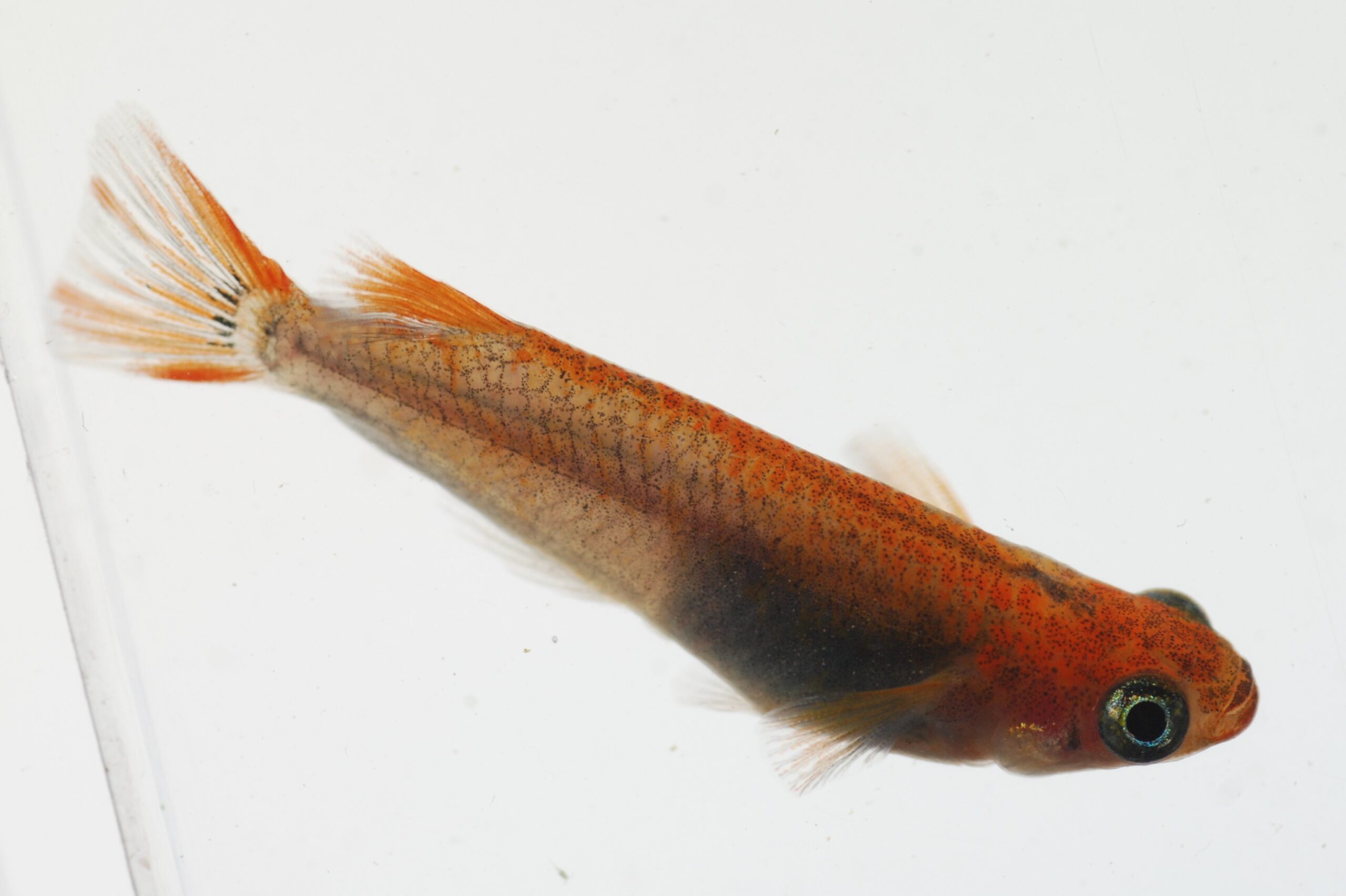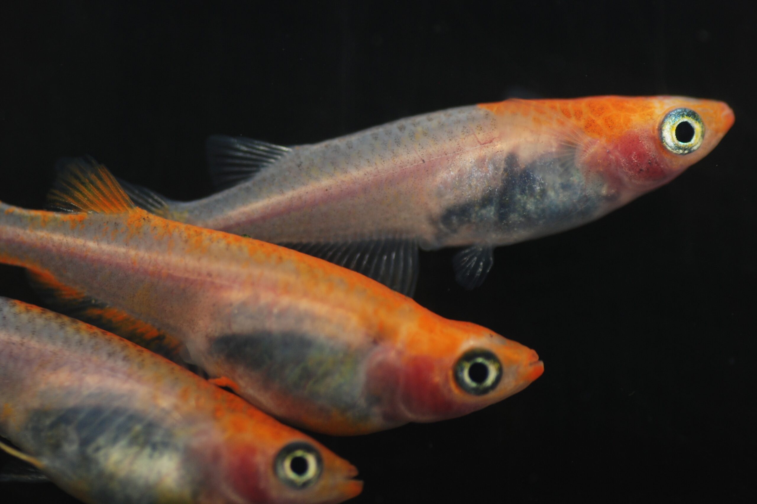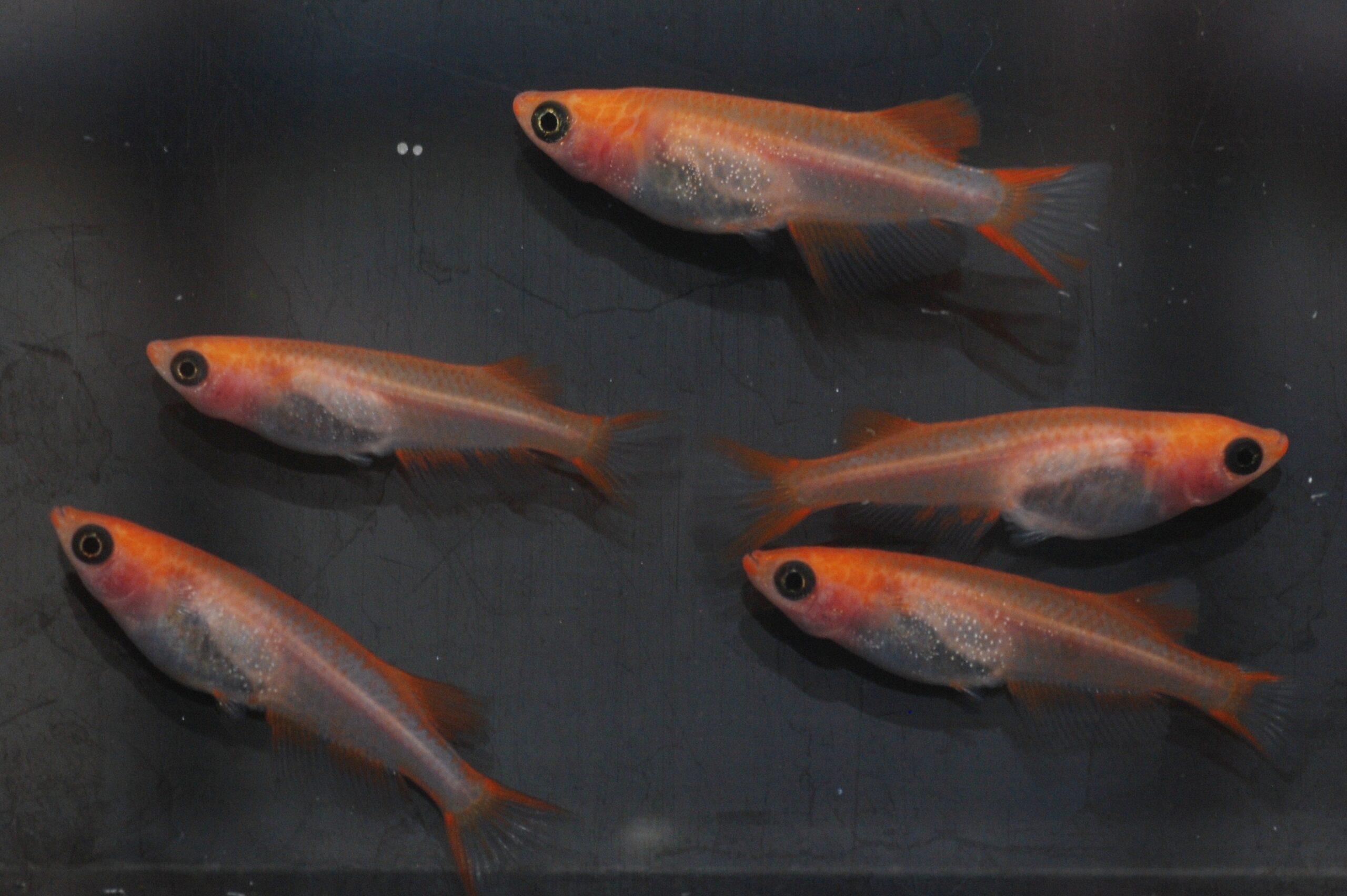 朱体色で透明鱗、パンダの形質(特徴)を持つメダカです。