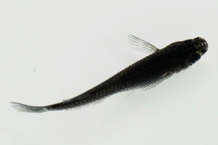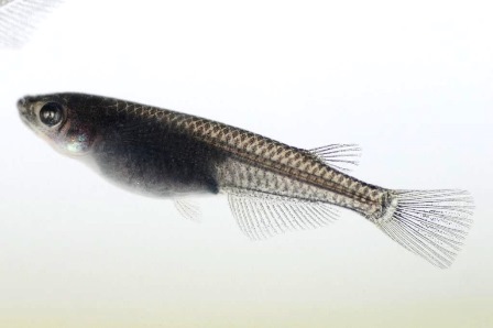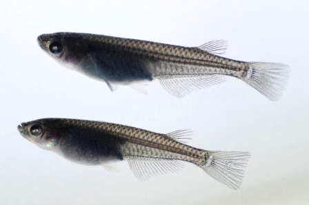 ピュアブラックメダカの目はスモールアイであるため背地反応しないという特徴を持ち,結果として黒体色を発現しています。