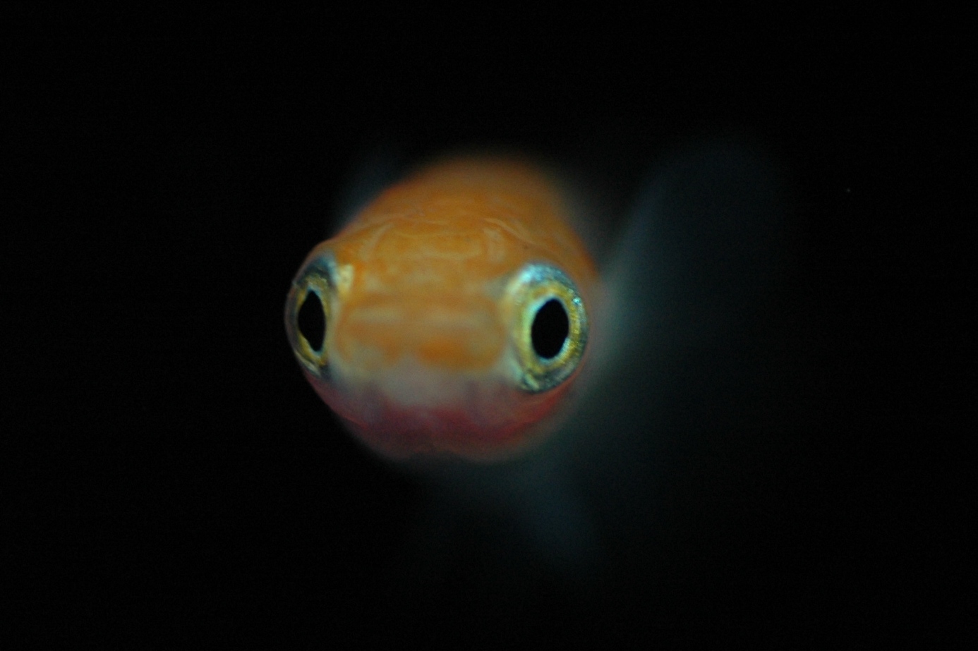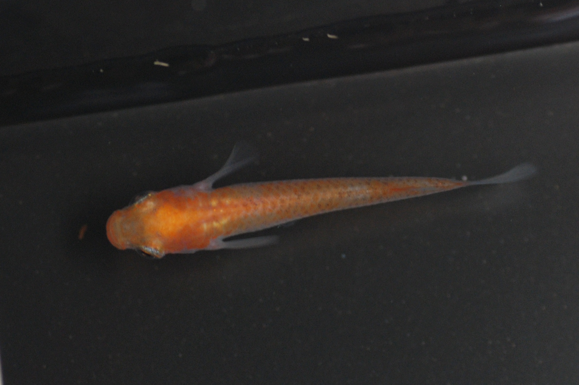 朱赤体色で透明鱗、目前の形質を持つメダカです。