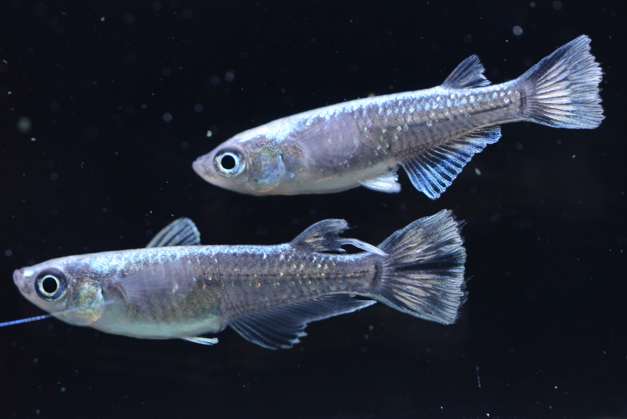 2021年に田中氏が作出した、黒体色でモルフォ、ヒレライン光の形質を持つメダカです。