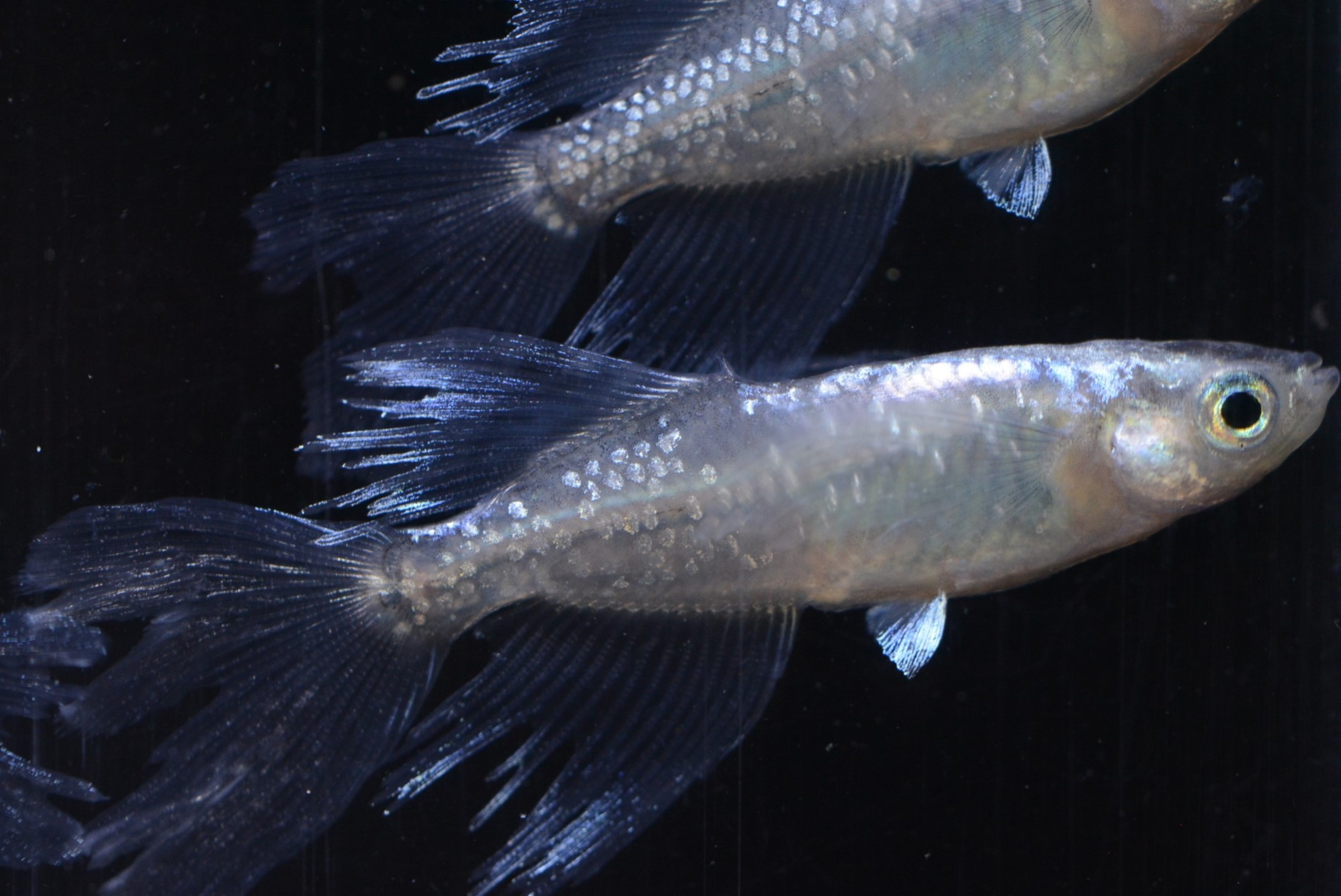 青体色でラメ、体外光、ヒレ長の形質を持つヒカリ体型のメダカです。
