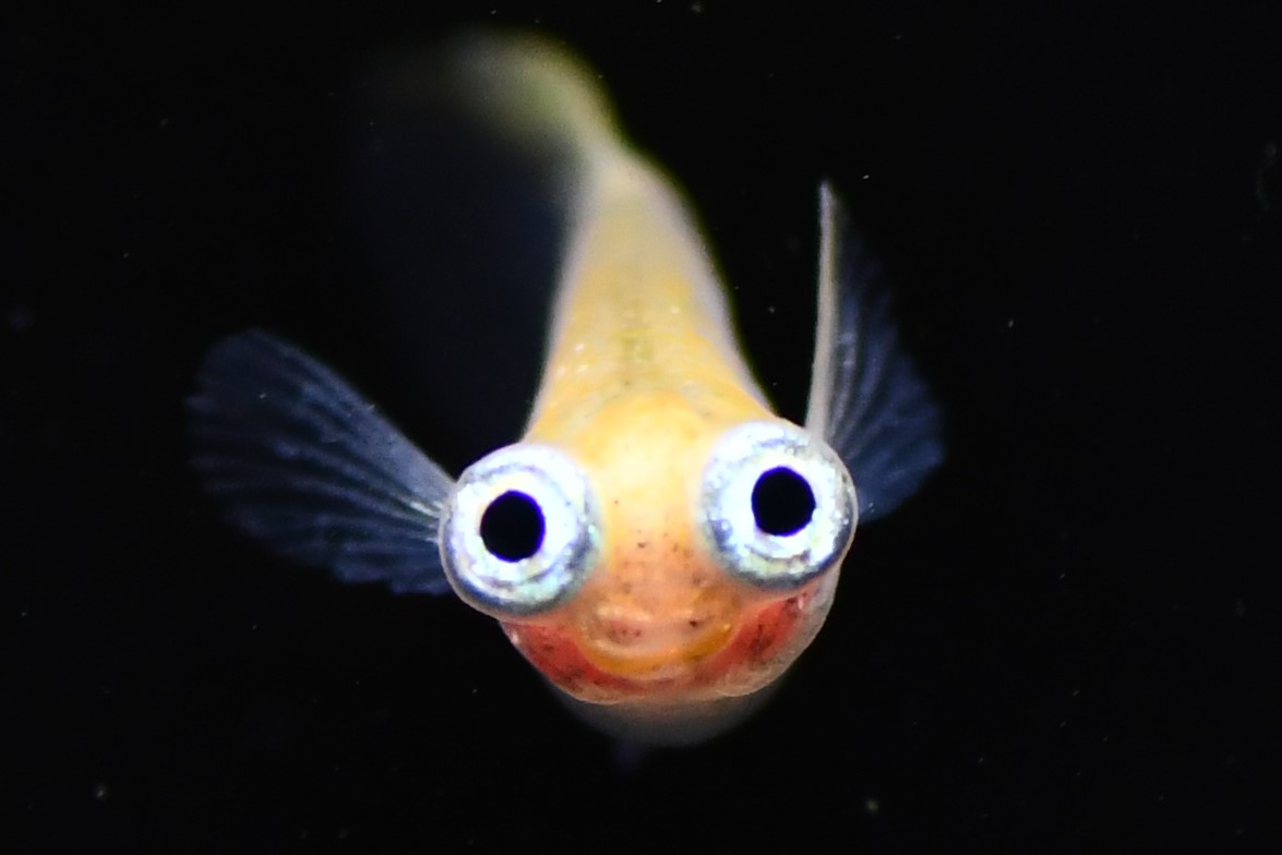 目前メダカは2007年に木下氏が発見。目が斜め前を向いていることで正面から見ると目を合わせ ることができるメダカです。数あるメダカの中でも、メダカと目が合う品種は目前メダカだけです。