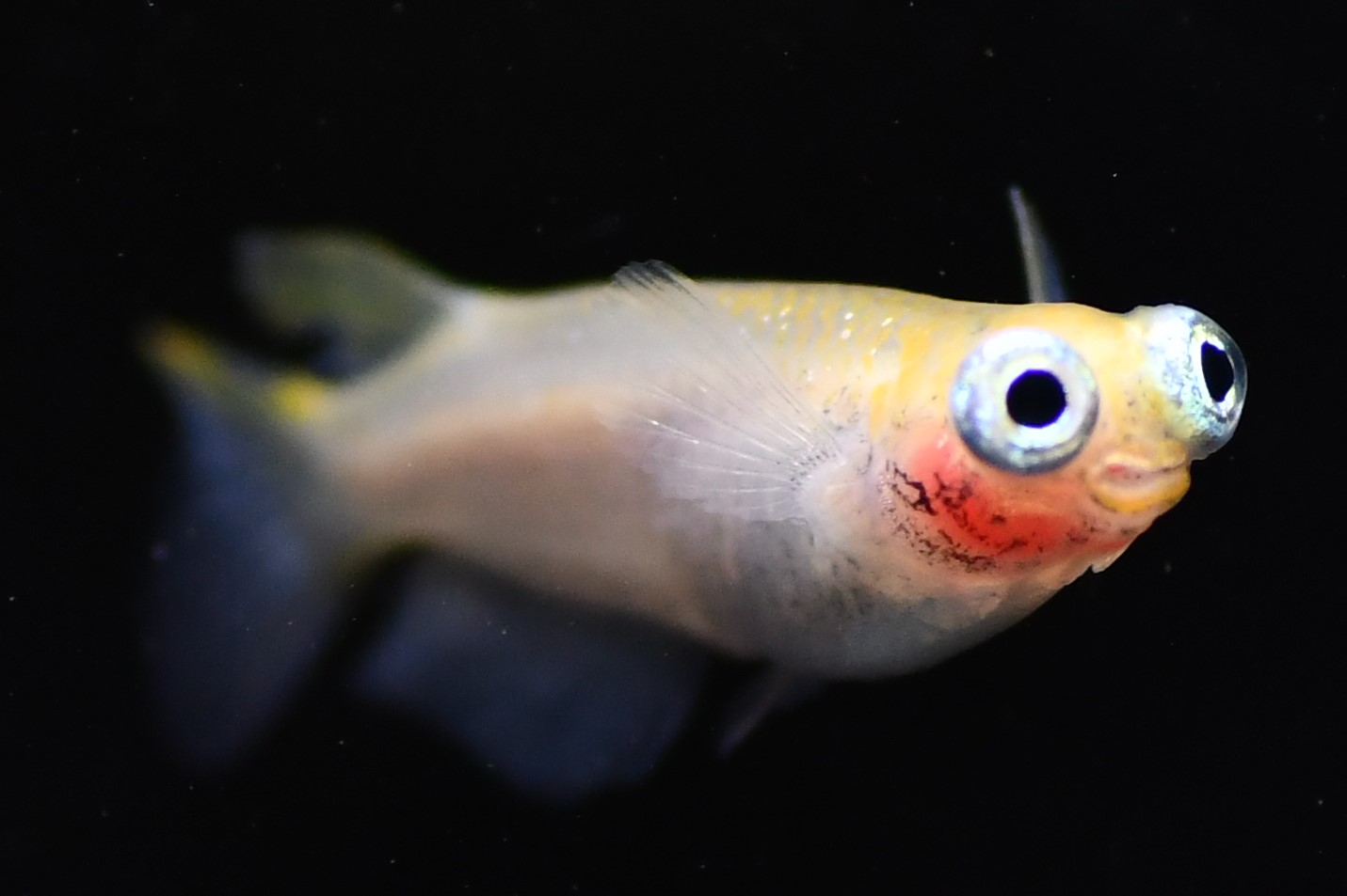 出目目前メダカは,目が前に向いた「目前メダカ」と、目が飛び出た「出目メダカ」との交配によって作出されました。