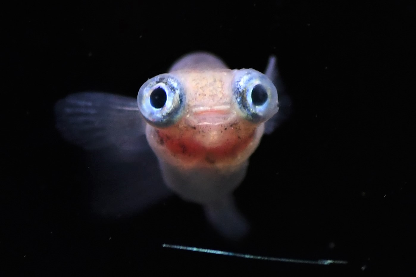 出目目前メダカは、「目と目が合う 癒しのメダカ」をイメージして作出された、出目と目前の特徴を併せ持つメダカです。