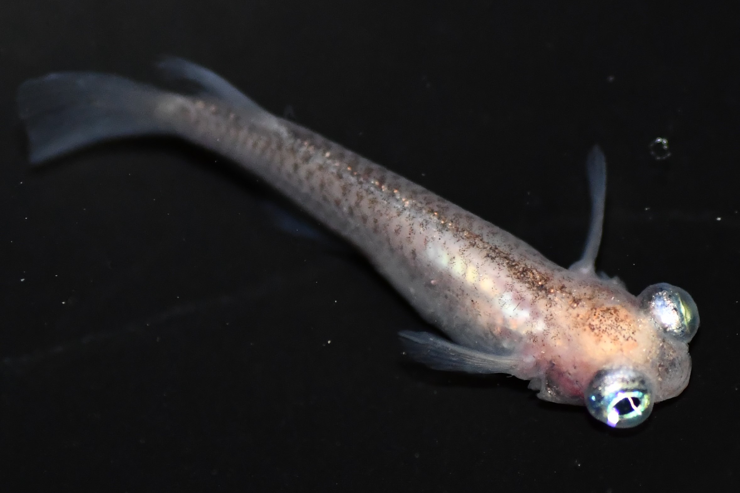目前メダカを上から見た図。目が斜め前を向いているのが確認できます。