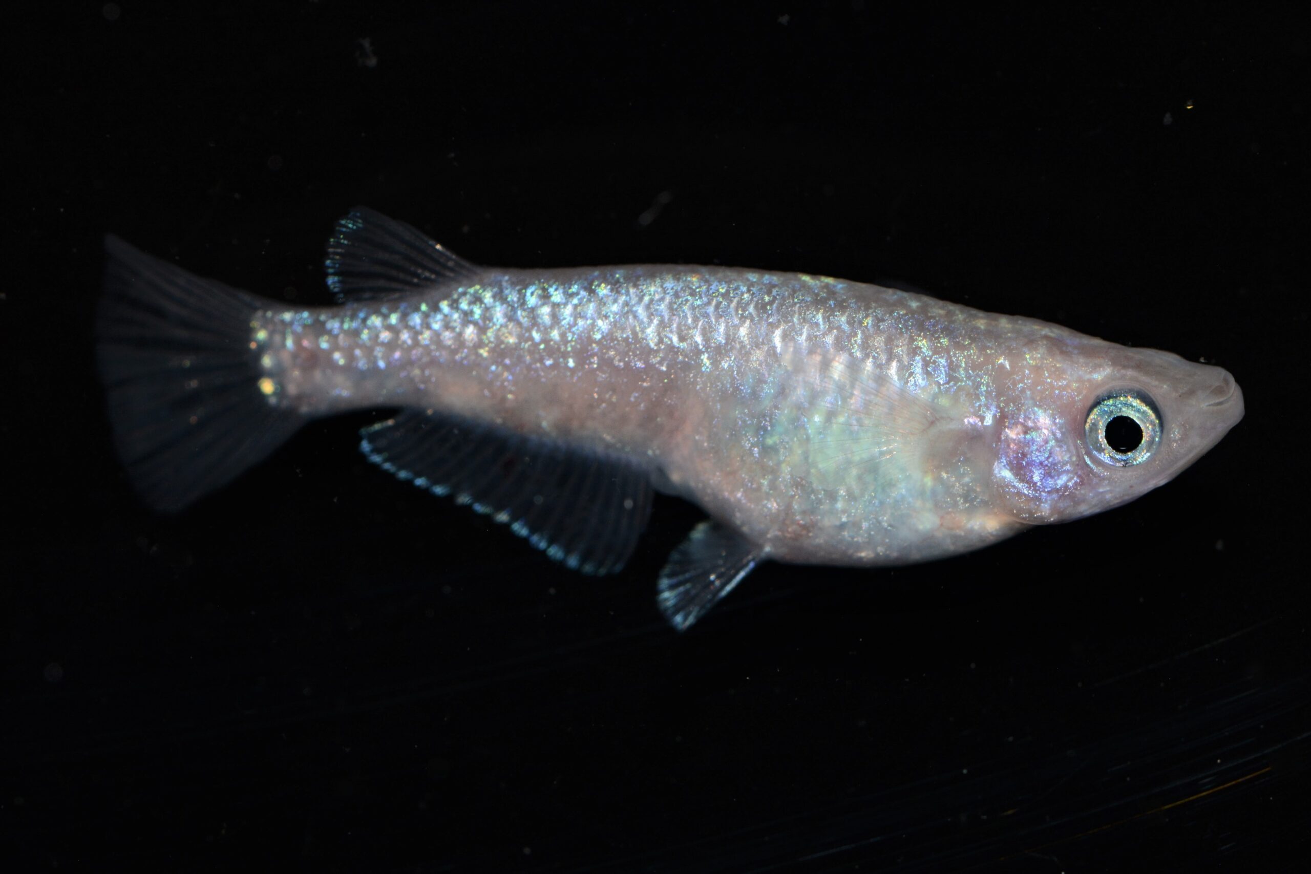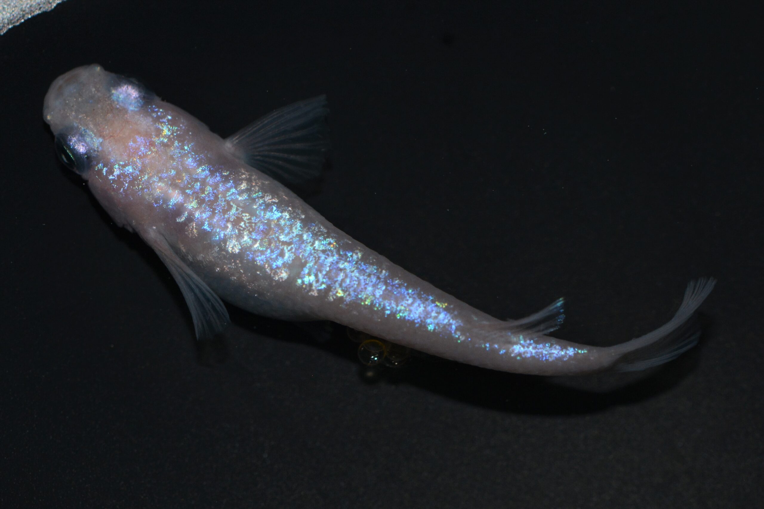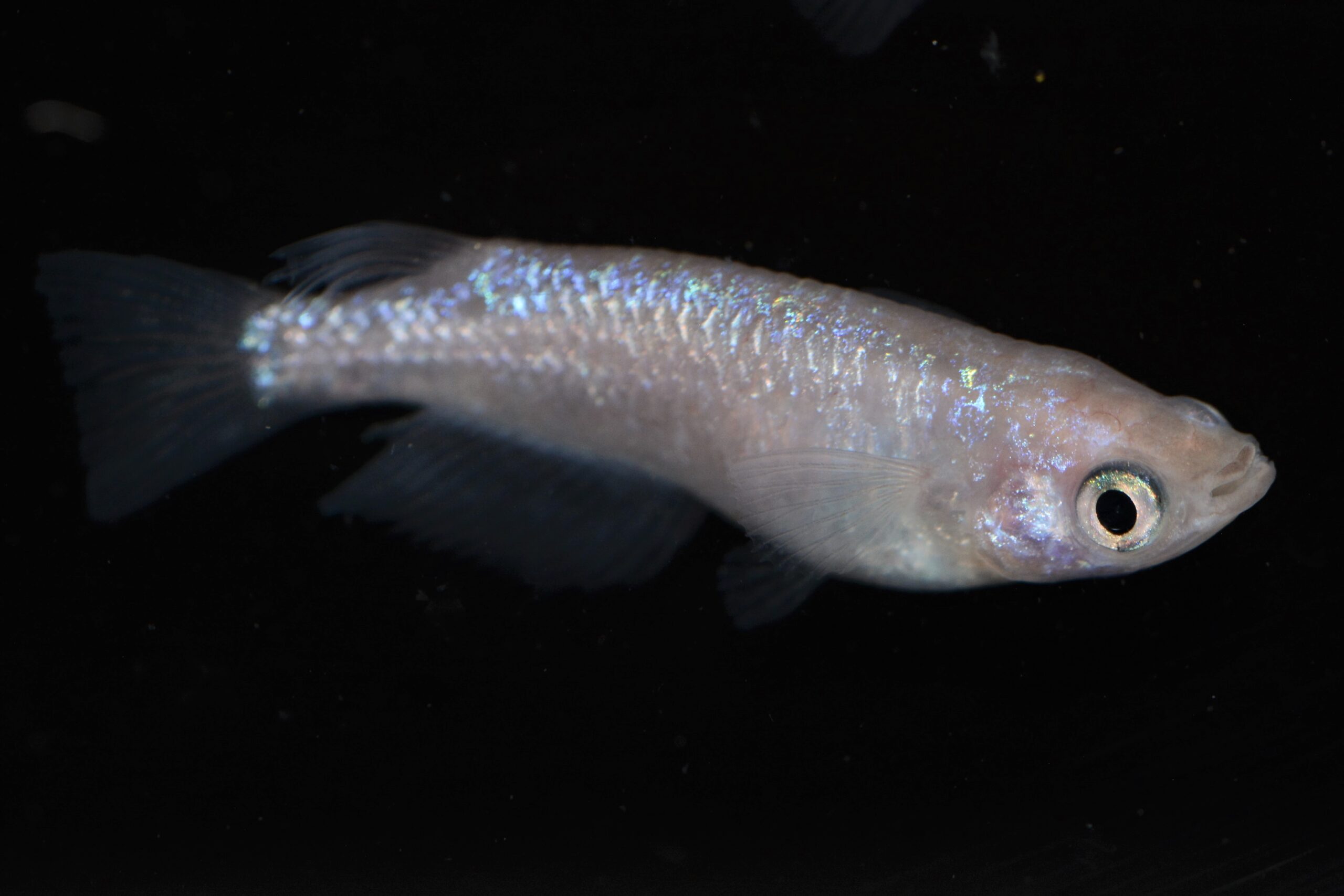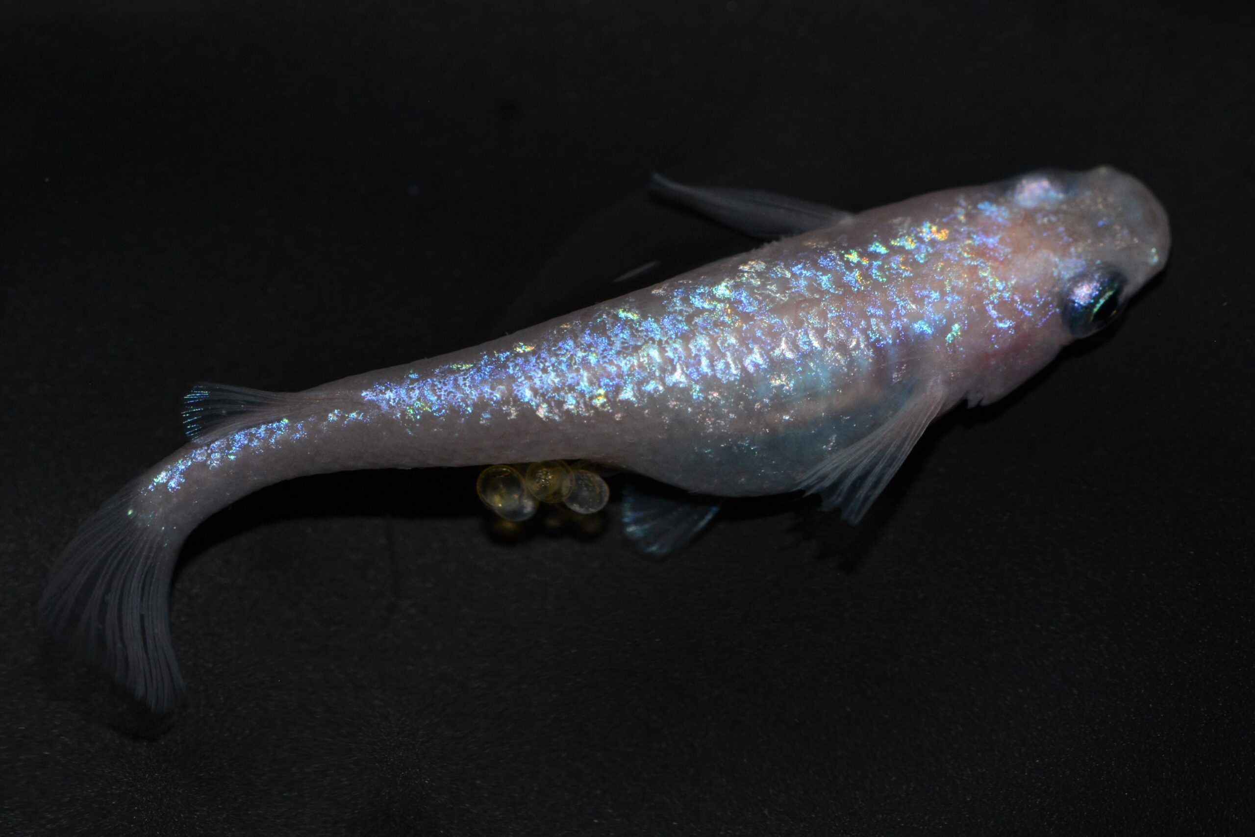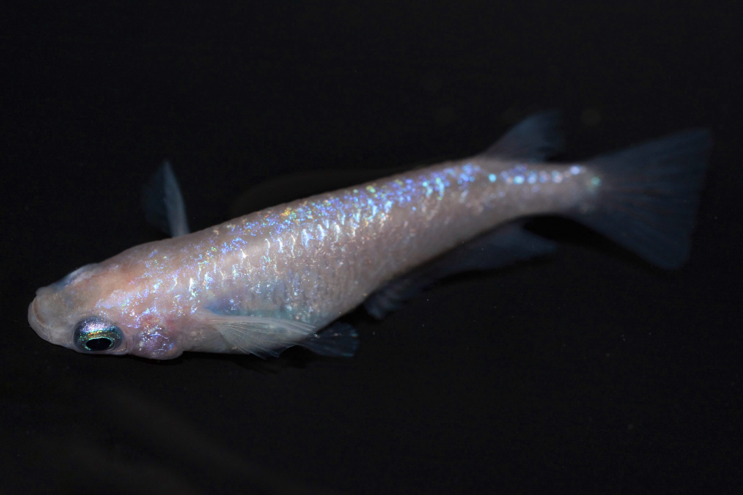 ブルーラメは黄色素胞の上に発現しにくい傾向があり、鮮やかなブルーラメを発現させるためには黄色素胞を調整する必要があります。淡く透明感のあるピンク体色であることにより、ピンク体色とブルーラメが最大限に魅力を発揮できています。
