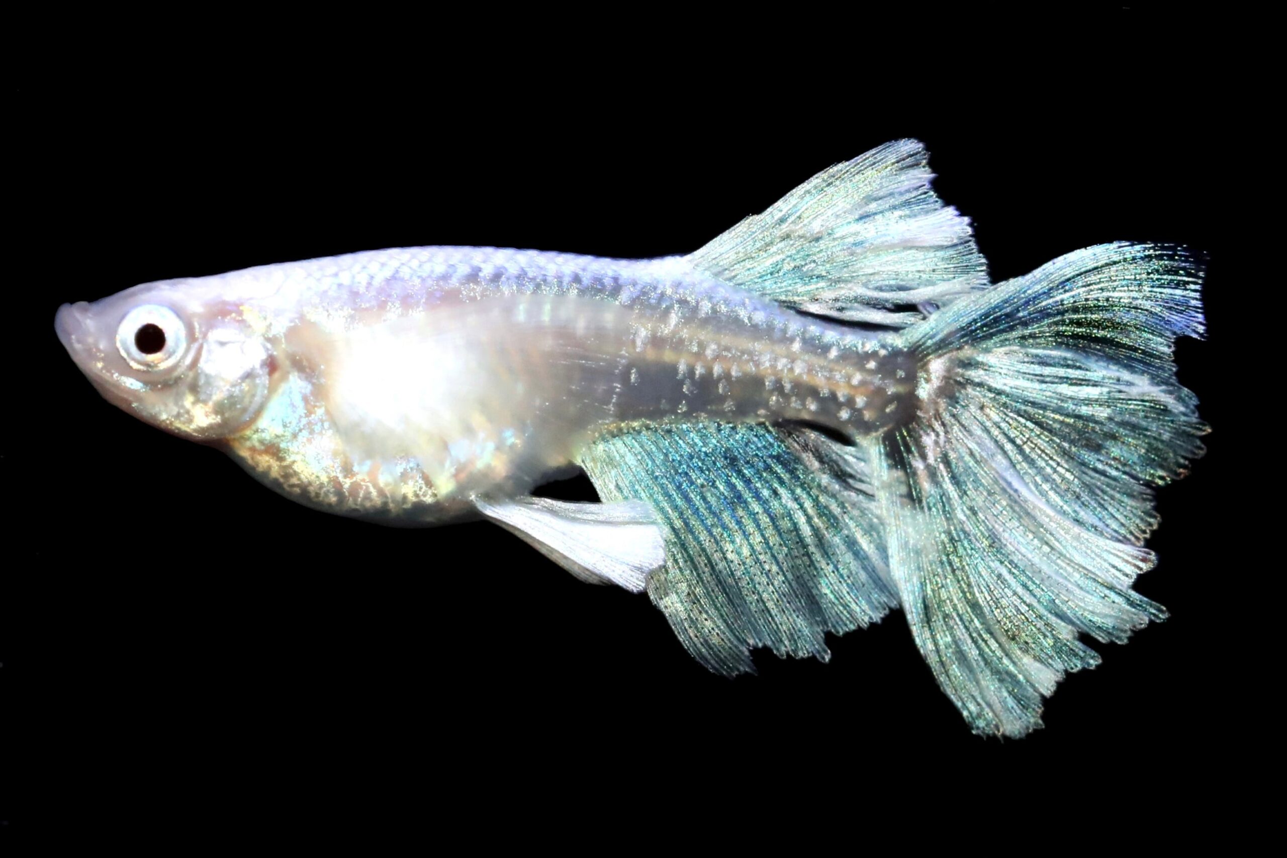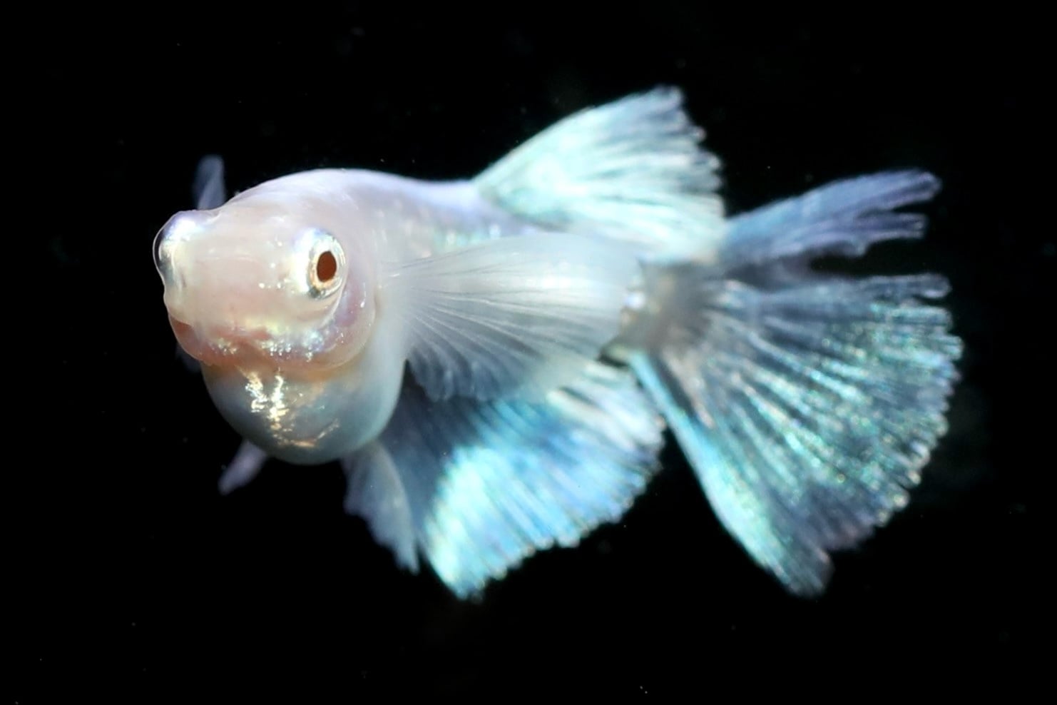 アクアマリンはアルビノの白い体にモルフォのヒレ光で青く光る大きなヒレが特徴です。プラチナ幹之の強いグアニンが体の側面にも発現する個体もいます。